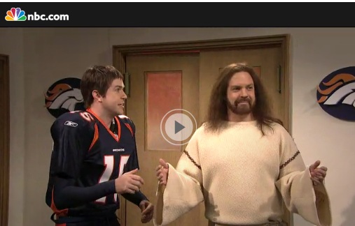 After a funny show – thanks in part to tons of funny former cast members returning as Jimmy Fallon (a former cast member himself) came back for the “Christmas Episode” – with a few moments to spare till the end, they went with a cheap, unfunny, pathetic and insulting “sketch.”  Having “Jesus” visit the Denver Broncos locker room post-game – Christ was portrayed telling Tebow to “tone it down”; took credit for all the victories (which is something none of us, including Tebow himself would ever claim) and then told Denver star kicker Matt Prater “Prater I pray to you.”