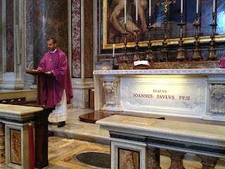 – We went on what is called the “Scavi Tour” – where you saw the excavations of what was underneath the Vatican which finished with seeing the actual bones of St. Peter, our first Pope. Here we were, staring at the remains of the man Jesus declared would be “the rock” upon which he would build the Church. One of the tour guides reminded us how St. Peter had laid down his life by being crucified upsides down (since he didn’t think he deserved to die the same way Jesus did), and that after the Romans killed him he was buried in the potters field of the time, a poor man’s grave. The Romans of the time, thought quite simply they were throwing out trash. Yet, Peters life, laid down for Jesus Christ and His Church was a “grain of wheat” it was a seed and to this day you can see what has grown – both physically and spiritually out of that very tomb…as you see the spectacular richness of the magnificent St. Peters Basilica – just a visible expression of the richness of our faith…