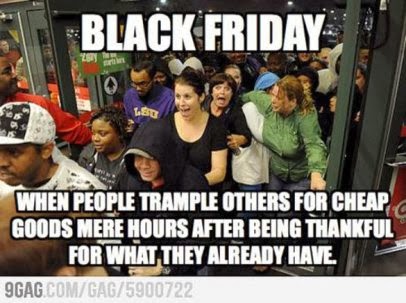 I’m not trying to make people who went shopping on Black Friday Eve (which we used to call Thanksgiving Day) feel bad. I have friends and family who’ve made this a bonding time that they look forward too. And I don’t want to go through a litany of stories about near-riots over $98 Television sets. Go google that if you want to read about that relatively recent annual tradition that happens now as a result of all this (and while you’re googling that, take a look at some financial news stories that prove how people don’t really end up getting any greater deals on Black Friday then they could’ve on Veterans Day or in a week or two)