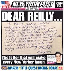 So on the front page of the NY Post a few weeks ago carried the words in bold headline: “DEAR REILLY” with the sub headline: The letter that will make every New Yorker laugh. I like to laugh, so, I was curious to see the letter that this major newspaper found hysterical. The background to the story goes that Reilly Flaherty a 28 year old guy from Brooklyn had been out at a concert when his wallet was misplaced. About 2 weeks later he received a letter in the mail with the following so-called funny letter: